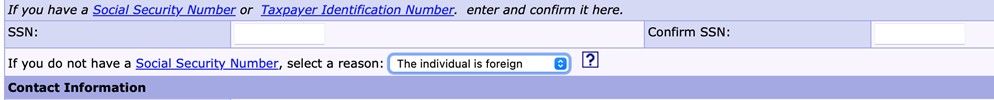 关于SSN社会安全号码,这样填写:在“SSN:”和“Confirm SSN:”处留空,在下方的“If you do not have a Social Security Number,select a reason:”中选择该人士为外国公民“The individual is foreign”即可。